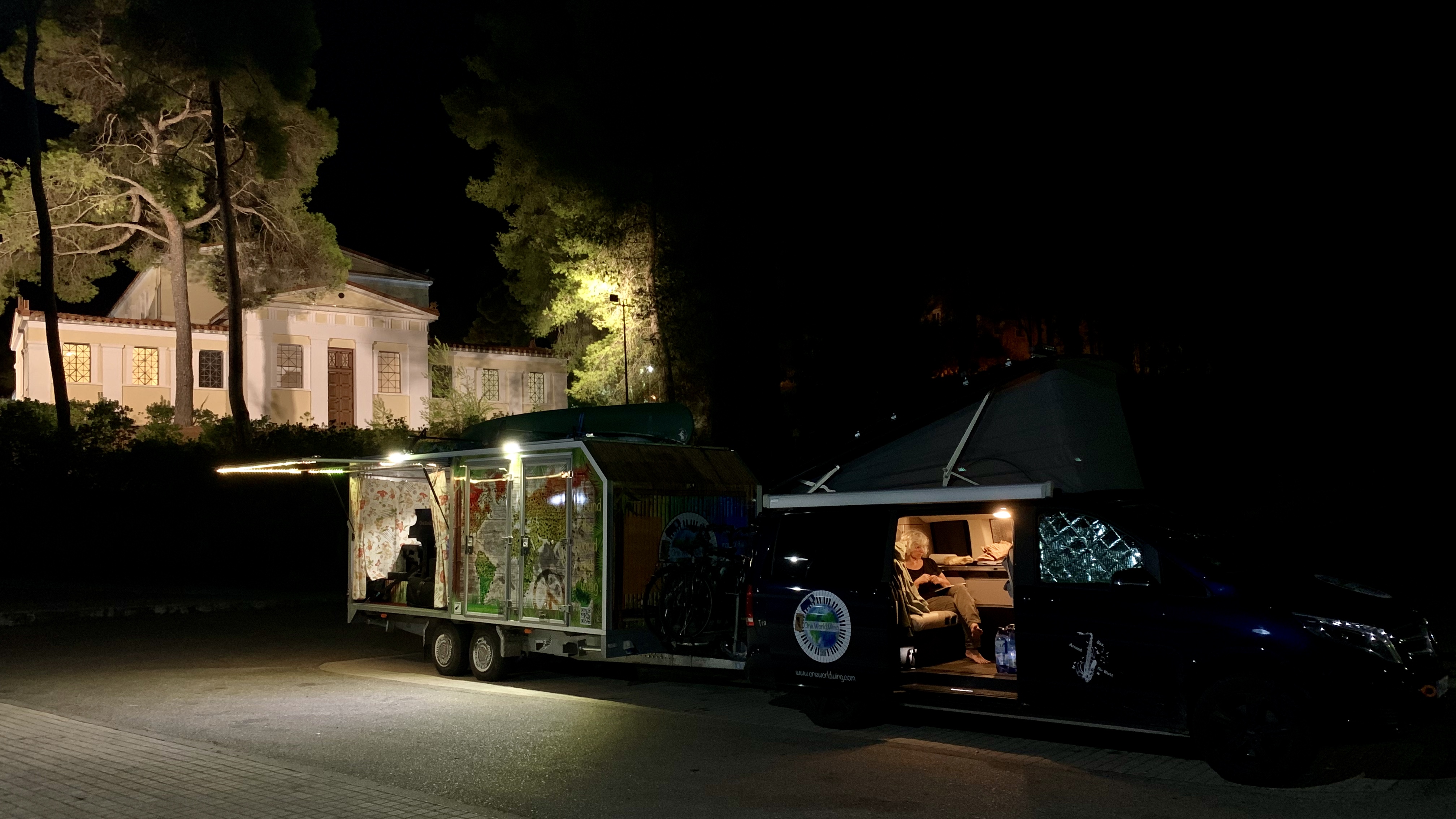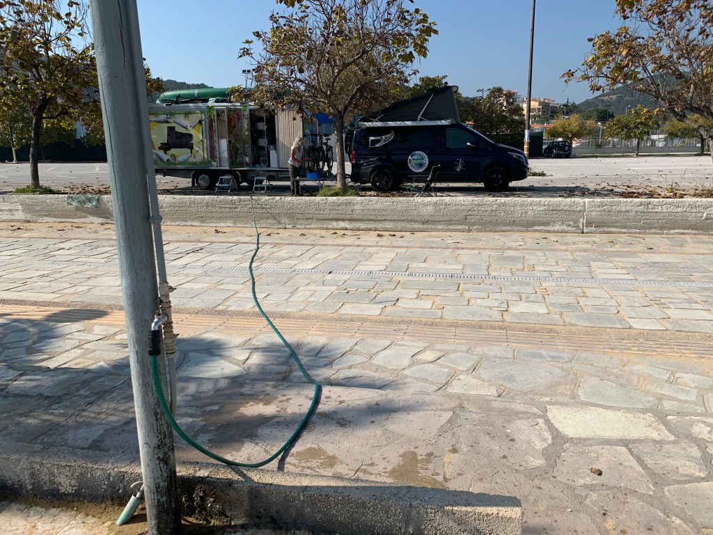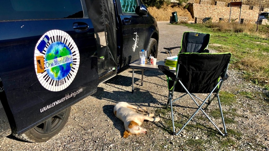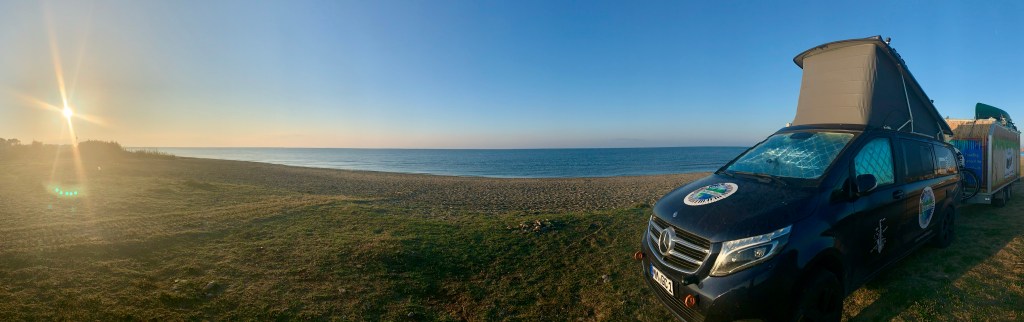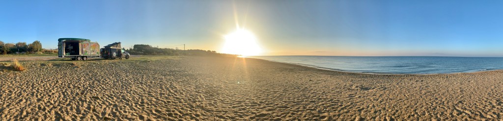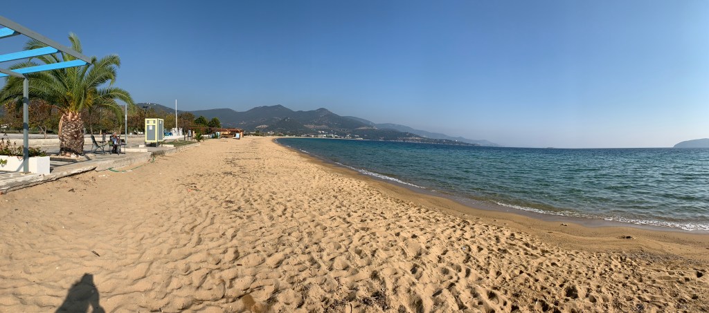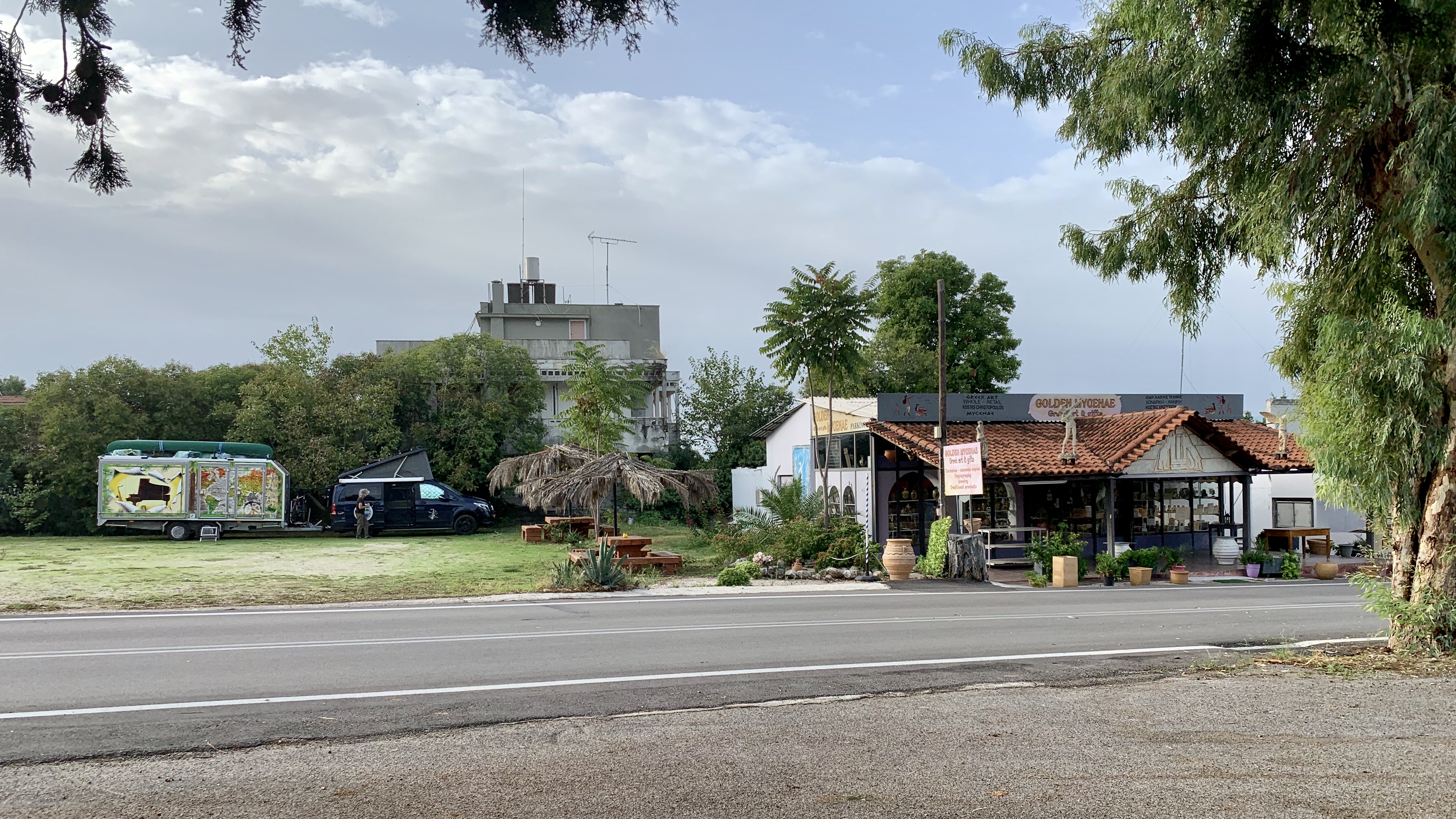 Auf dem Weg in die Türkei machten wir noch zweimal Station. Einmal übernachteten wir auf einem ziemlich leeren Parkplatz vor der Promenade von Eleftheres, wo wir am nächsten Morgen einen exklusiven Frühstücksplatz hatten – und den Wasserhahn der Stranddusche zum Auffüllen unserer Wasservorräte anzapfen konnten…