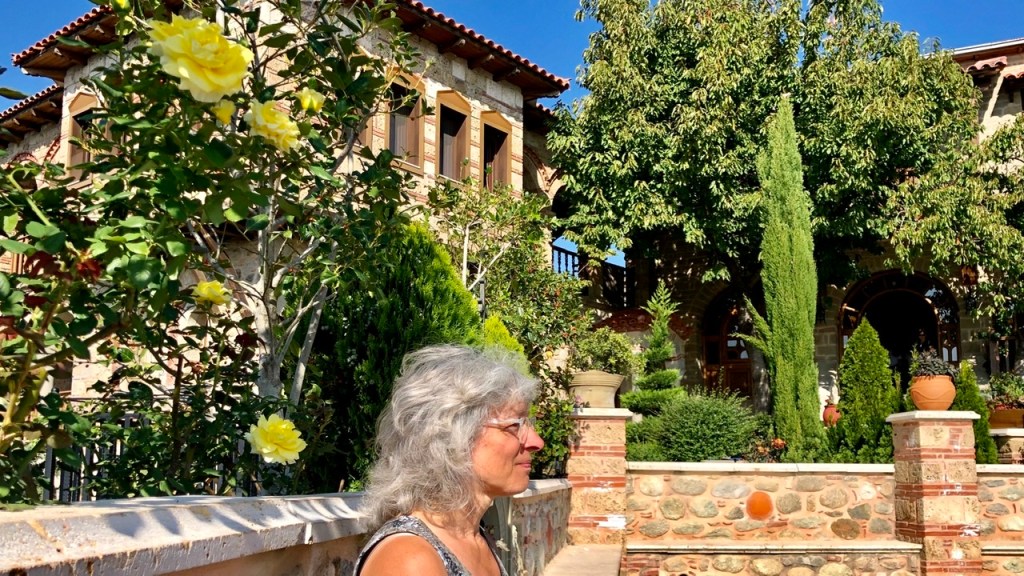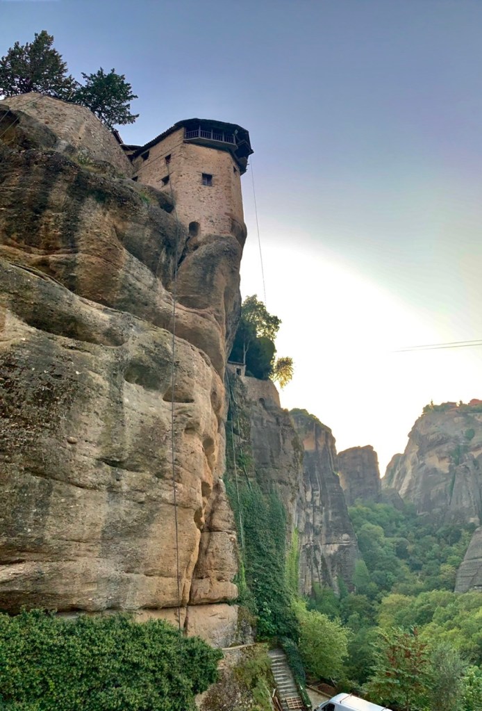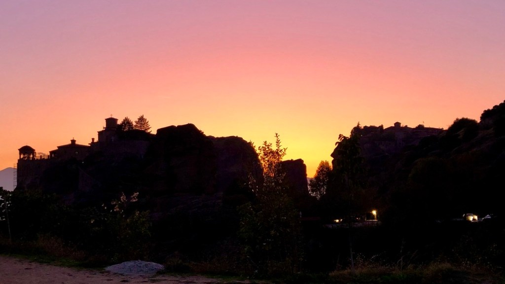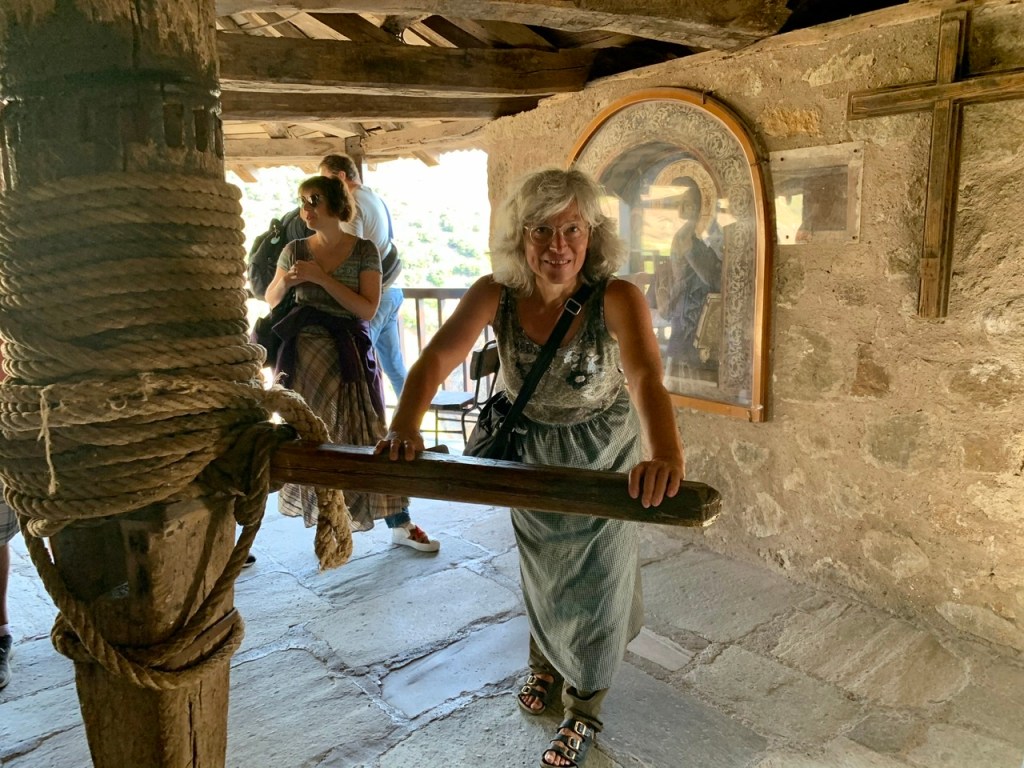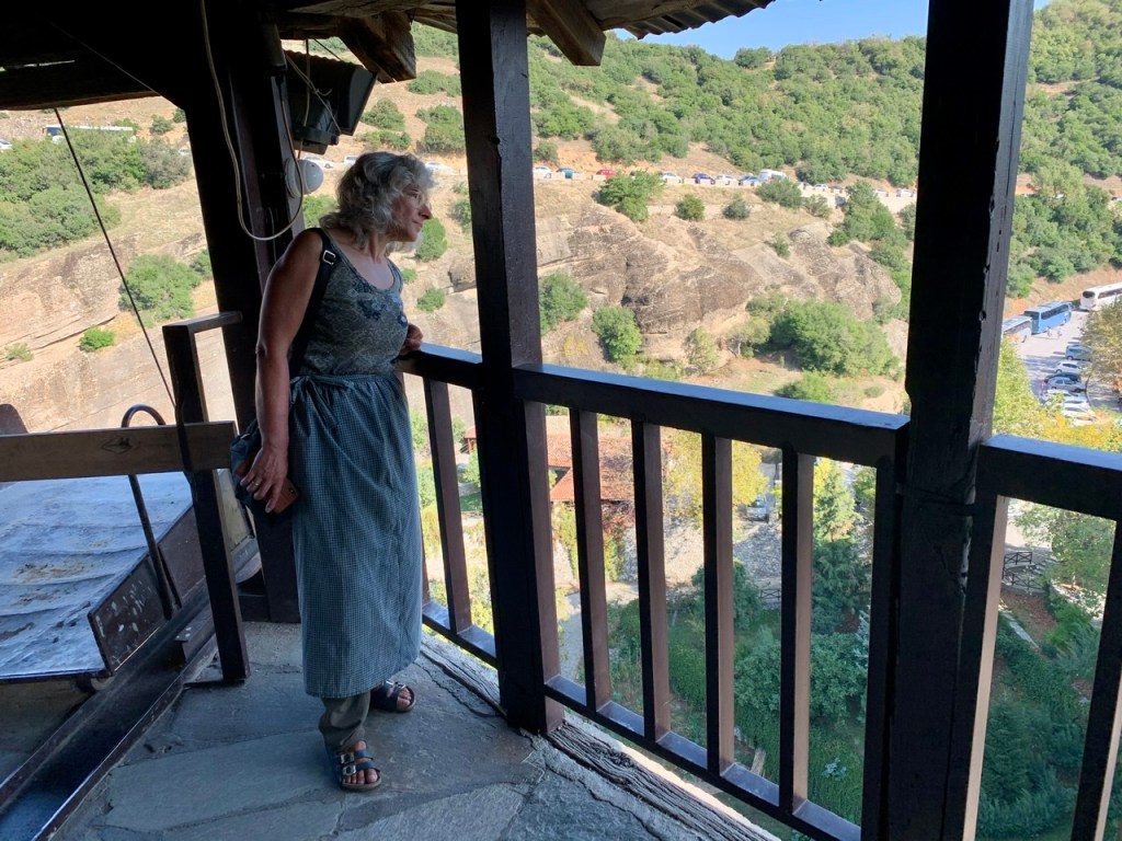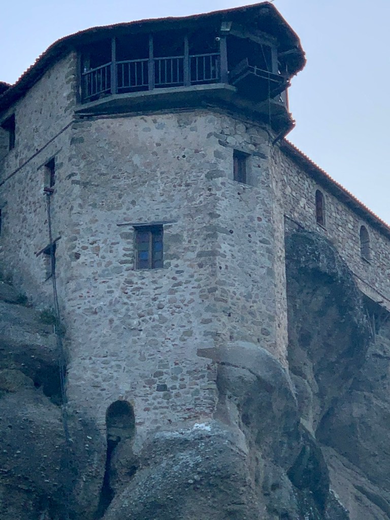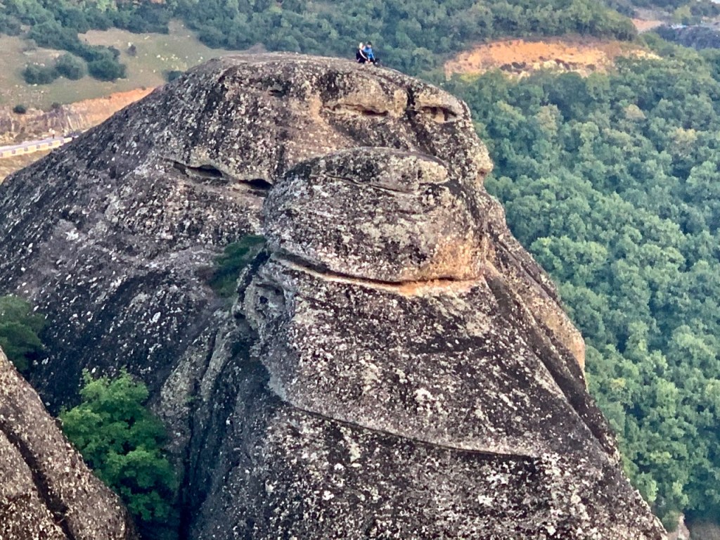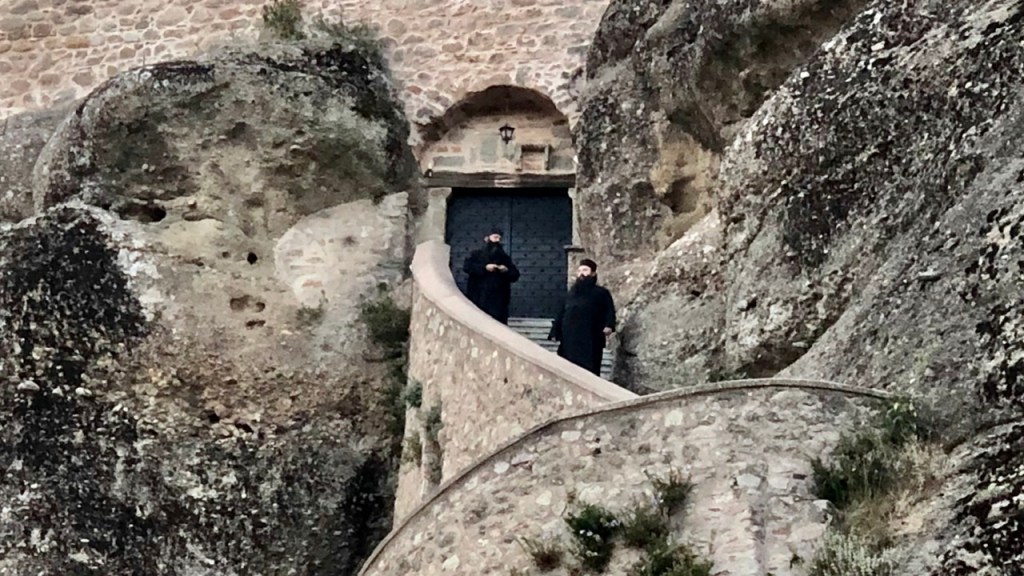 Man muss über die vielen Reisebusse und Horden von Touristen schon hinwegsehen. Dann aber eröffnet sich eine beeindruckende Komposition aus bizarren Gebirgsformationen, waghalsiger Architektur und pittoresken Gestaltungen der zugänglichen Klosterräume. Es gab ursprünglich 24 Klöster, die in schwindelerregenden Höhen auf Felsspitzen gebaut wurden. Einige der Meteora-Klöster sind heute noch bewohnt und können besichtigt werden. Wir haben uns aber nur eines angeschaut – nach dem Motto: ,Kennst du eines, kennst du alle…‘ Am Vorabend der Innenbesichtigung stiegen wir schon mal die zugängliche Außentreppe bis zum Portal hinauf. Da kamen uns tatsächlich zwei ‚Monks‘, also Mönche entgegen. Keinesfalls zu verwechseln mit den ‚Monkeys‘, deren Gesichter man auf manch‘ Felsen zu erkennen glaubt… 😉