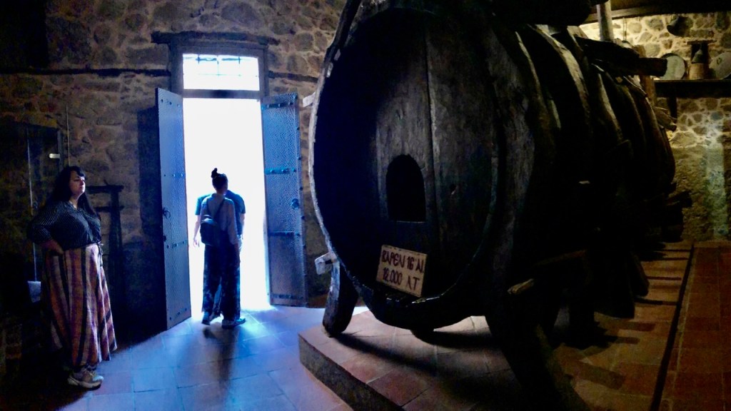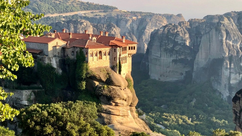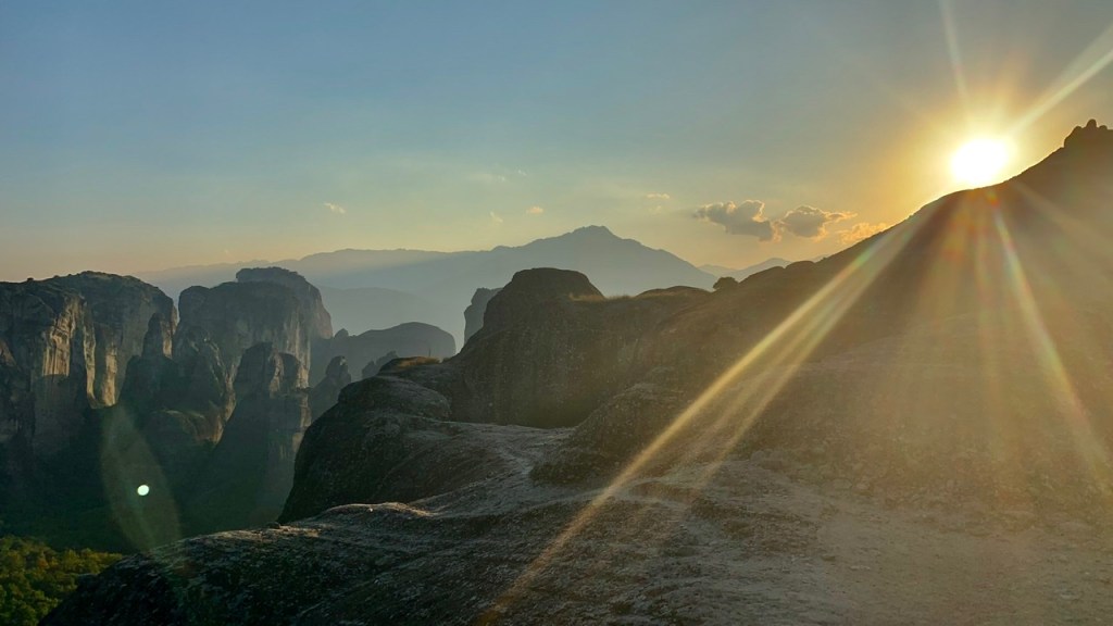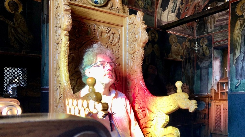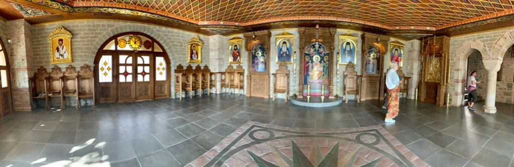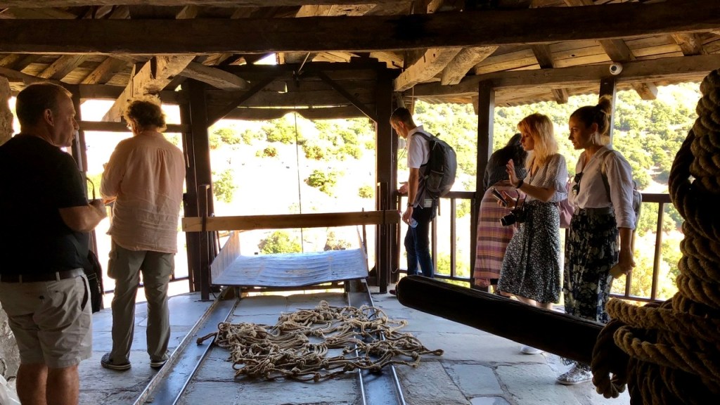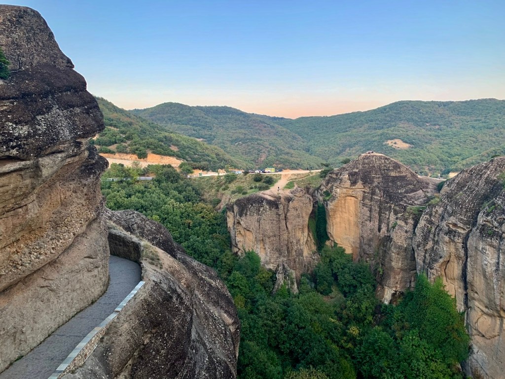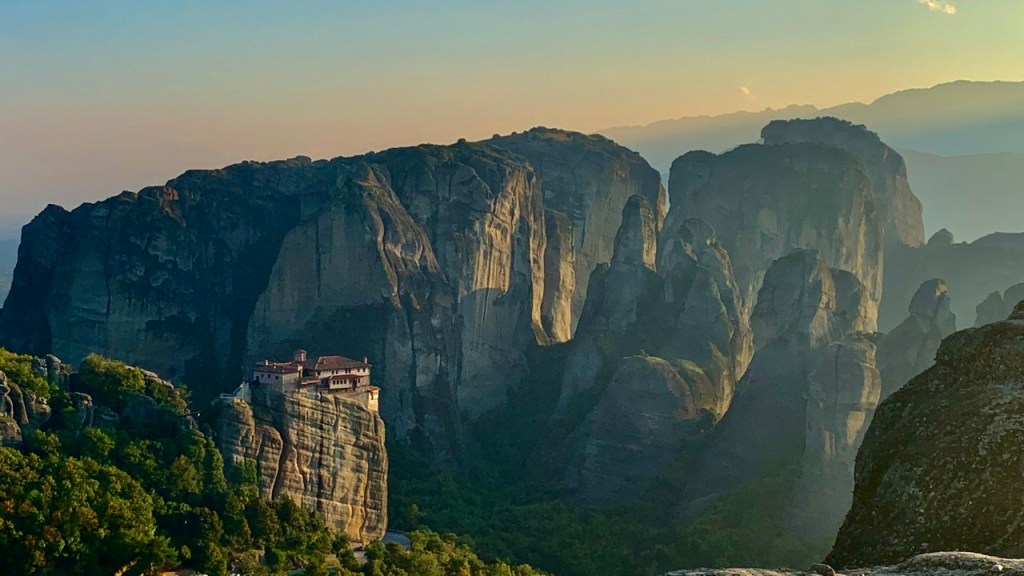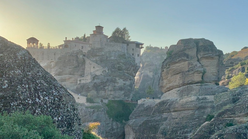 Man muss über die vielen Reisebusse und Horden von Touristen schon hinwegsehen. Dann aber eröffnet sich eine beeindruckende Komposition aus bizarren Gebirgsformationen, waghalsiger Architektur und pittoresken Gestaltungen der zugänglichen Klosterräume. Es gab ursprünglich 24 Klöster, die in schwindelerregenden Höhen auf Felsspitzen gebaut wurden. Einige der Meteora-Klöster sind heute noch bewohnt und können besichtigt werden. Wir haben uns aber nur eines angeschaut – nach dem Motto: ,Kennst du eines, kennst du alle…‘ Am Vorabend der Innenbesichtigung stiegen wir schon mal die zugängliche Außentreppe bis zum Portal hinauf. Da kamen uns tatsächlich zwei ‚Monks‘, also Mönche entgegen. Keinesfalls zu verwechseln mit den ‚Monkeys‘, deren Gesichter man auf manch‘ Felsen zu erkennen glaubt… 😉