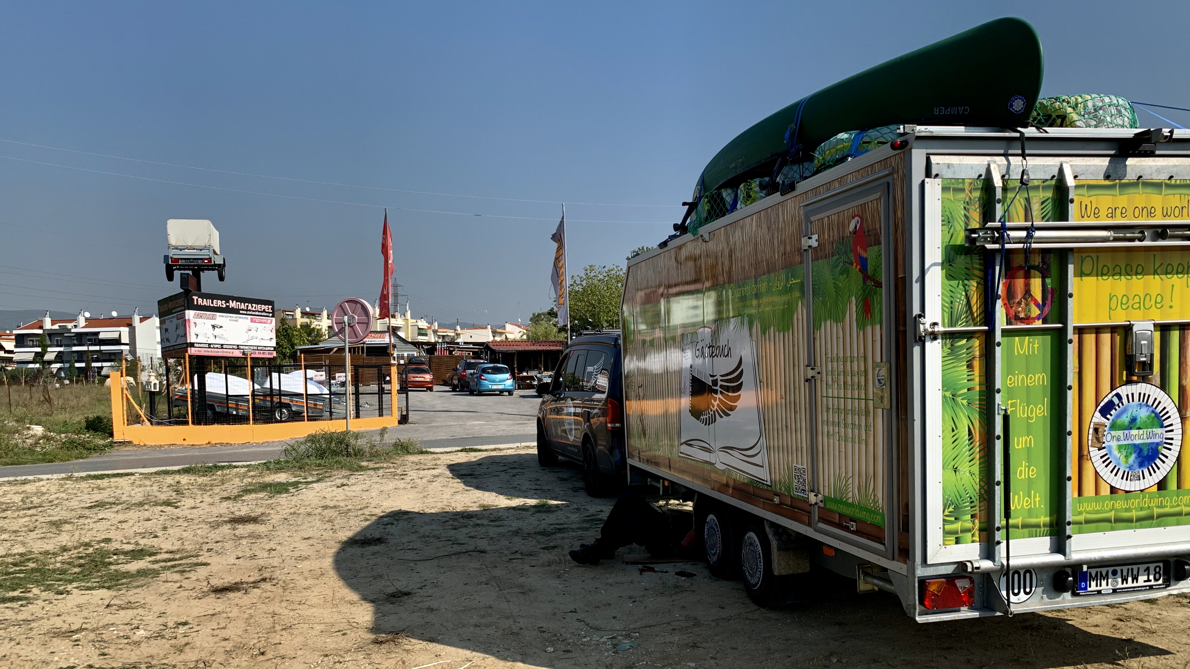 In Thessaloniki erhofften wir uns Hilfe durch eine Werkstatt, die Connys griechischer Kollege Giorgos für uns recherchiert hatte. Die Auflaufbremse des Anhängers tat nämlich nicht mehr, was sie eigentlich sollte. Leider waren auch die anderen beiden Werkstätten, zu denen die erste uns weitergeschickt hatte, mit unserem Anliegen überfordert, denn es scheiterte meist schon an der fehlenden Hebebühne der entsprechenden Größe. Die dritte hatte sogar extra einen Bremsenspezialisten für LKWs fünfzehn Kilometer weit anfahren lassen. Dieser bemühte sich eine Stunde lang redlich – leider vergeblich. Die Auflaufbremse eines Anhängers funktioniert eben doch anders als eine Laster-Bremse. Bevor er wieder zurück fuhr, wollten wir ihn natürlich für seine Zeit und Bemühungen entlohnen, – aber mehr als einen Handschlag nahm er nicht an. So sind sie, die Griechen. Zumindest manche…