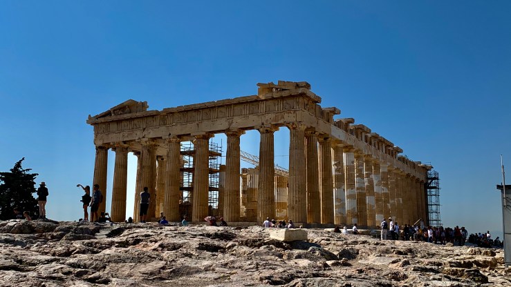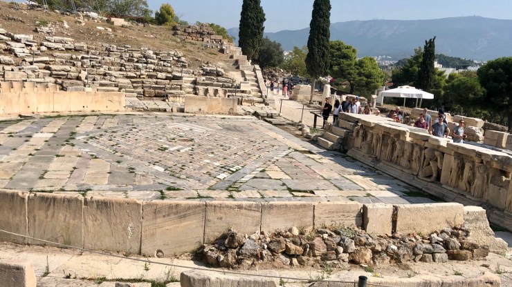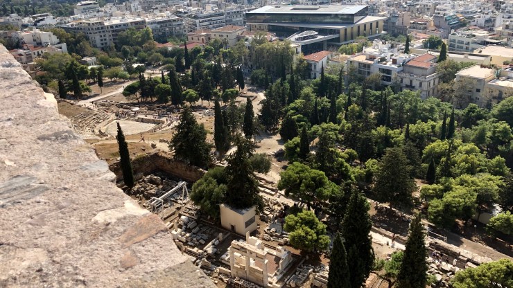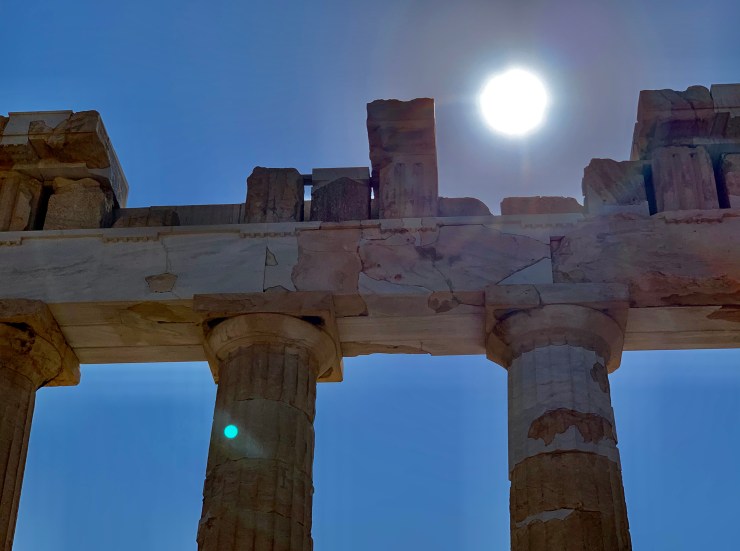 Hier angekommen fanden wir einen Schlafplatz unterhalb der Akropolis. Wir konnten also zu Fuß zur berühmten Sehenswürdigkeit starten. Ideal! Also stürzten wir uns ins Touristengetümmel. Oft wird der größte Tempel als ‚Akropolis’ genannt, aber eigentlich bezeichnet dieser Name die Festung auf dem Hügel (wörtlich: ‚Oberstadt‘), die aus mehreren Gebäuden besteht. Dieser größte Tempel ist der ‚Parthenon‘. Dazu kommen noch zwei Theater am Fuße der Akropolis: das ‚Dionysostheater‘, das älteste Theater überhaupt in Griechenland, und das ‚Odeon des Herodes Atticus‘ mit 5.000 Sitzplätzen – als kleinere Version des Theaters von Epidauros, welches bis zu 14.000 Besuchern Platz bot. Bei weiterem fachlichen Interesse bezüglich der gesamten Akropolis guckst du hier…😉