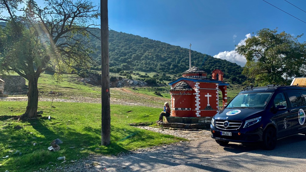 Von Meteora bis Thessaloniki war es ein gutes Stück zu fahren. Daher genehmigten wir uns eine Pause vor einer gewaltigen Kathedrale, die jedoch angesichts Connys menschlicher Größe sichtlich geschrumpft war… 😉