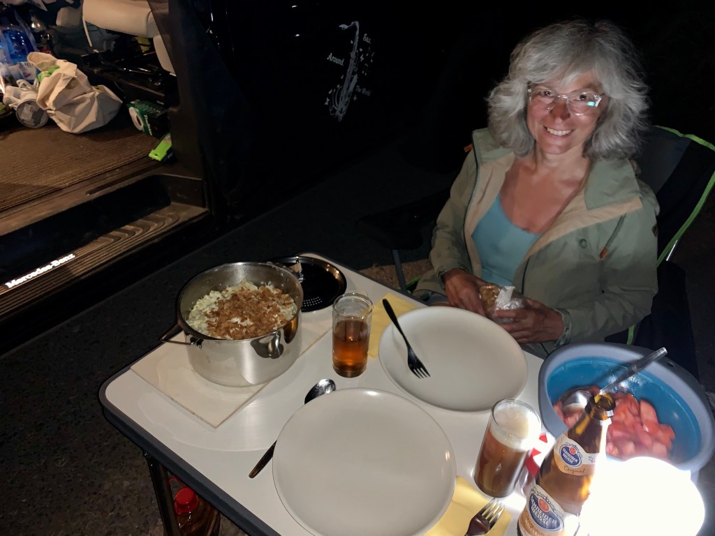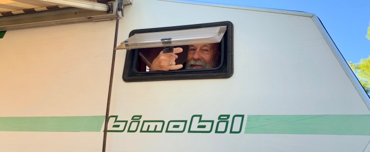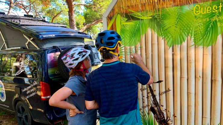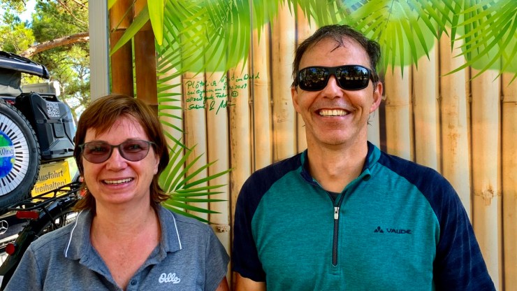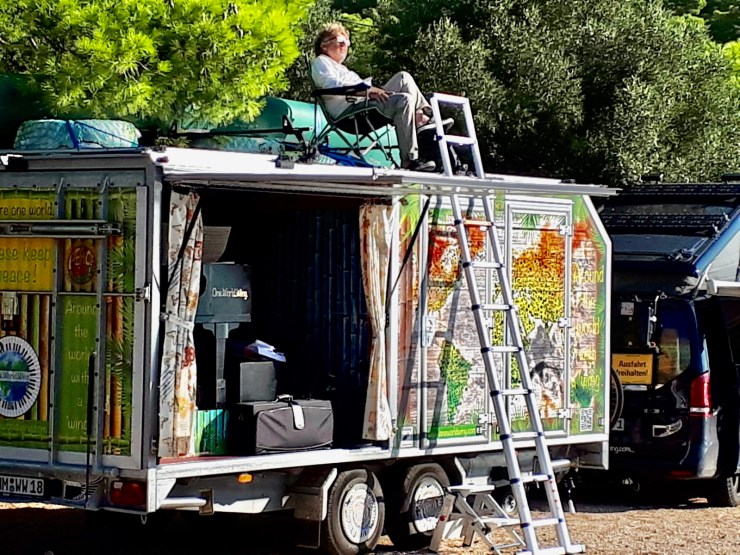 Kaum hatten wir unser Lager aufgeschlagen, standen schon unsere neugierigen, aber sehr freundlichen Nachbarn an unserem Gefährt und wollten wissen, ob da wirklich drin ist, was drauf steht. Es waren natürlich wieder mal Deutsche. Und auch Österreicher. Als wir abends musizierten, erwiesen sie sich als begeisterte Zuhörer, die daraufhin fast immer anrückten, sobald aus unserer Richtung ein musikalischer Laut zu vernehmen war. Natürlich mussten auch hier unsere ‚treuesten Fans‘, Eckard und Helma, die innerhalb von drei Tagen zu Freunden wurden, sich auf unserer Gästebuch-Wand verewigen.