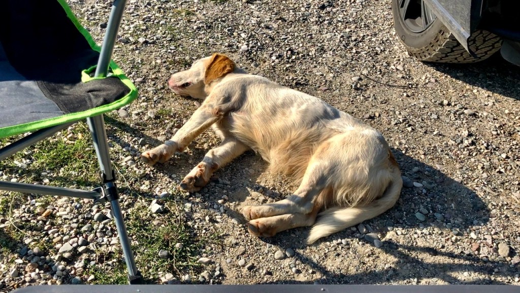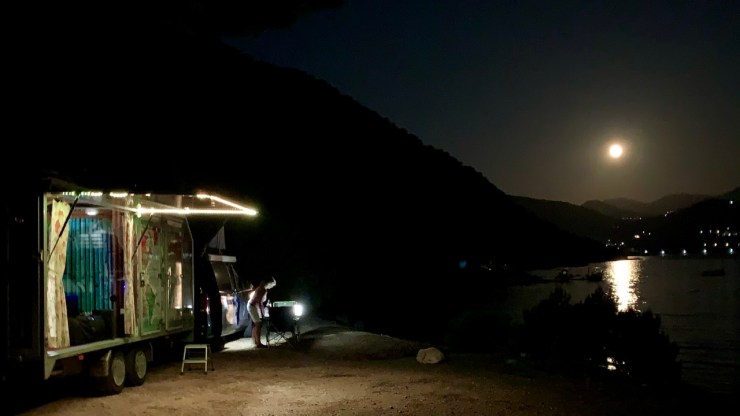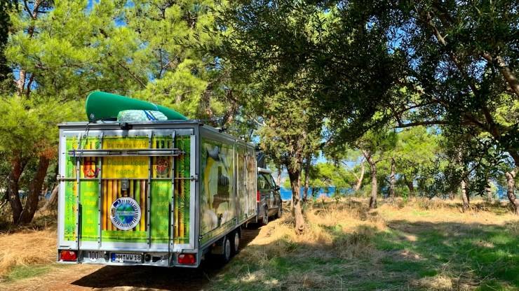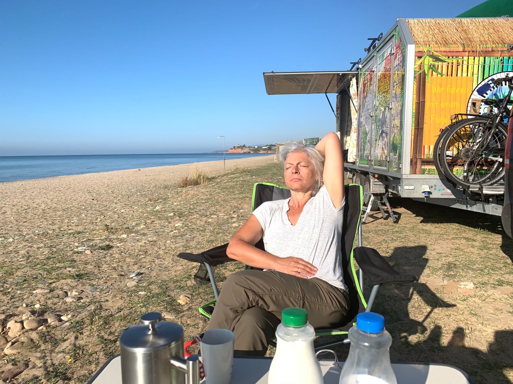 Hier verbrachten wir ein paar Tage an einem total ‚chilligen‘ Platz, wo neben schattigen Bäumen und einem Sandstrand zwei kleine Restaurants zu finden waren – und einige lustige Nachbarn, die in sehr unterschiedlichen fahrbaren Behausungen angereist waren. Wir stellten uns ganz frech ganz an der Seite des Platzes auf die schönste Stelle unter eine Kiefer direkt am Wasser. Dies war der zweite Ort, von dem wir am liebsten gar nicht mehr weggefahren wären…