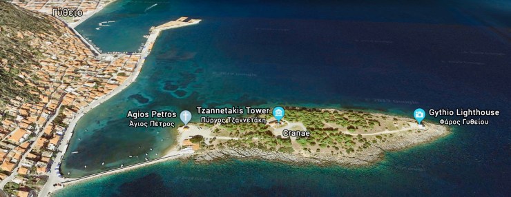 Gytheio ist eine kleine Stadt entlang eines langen Piers mit vielen Restaurants und Hotels. Ein bisschen touristisch, aber ganz nett. Zunächst waren wir unsicher, ob es erlaubt war, auf der Halbinsel zu kampieren, denn vor deren Zufahrt am Bootspier, stand ein sehr vergilbtes, verbogenes Schild mit durchgestrichenem Zelt und Wohnwagen. So entschlossen wir uns, die Halbinsel zunächst zu Fuß zu erkunden. Dieses Fleckchen Erde zeigte sich dabei derart verlockend, dass wir uns einfach auf den Standpunkt stellten, erstens ja nicht zu zelten und zweitens keinen Wohnwagen dabei zu haben. Nein, unser Anhänger ist so manches, aber eben kein Wohnwagen! Und nicht im Auto schlafen zu dürfen, davon stand auf dem Schild ja nichts…