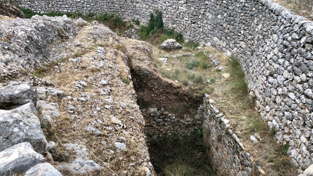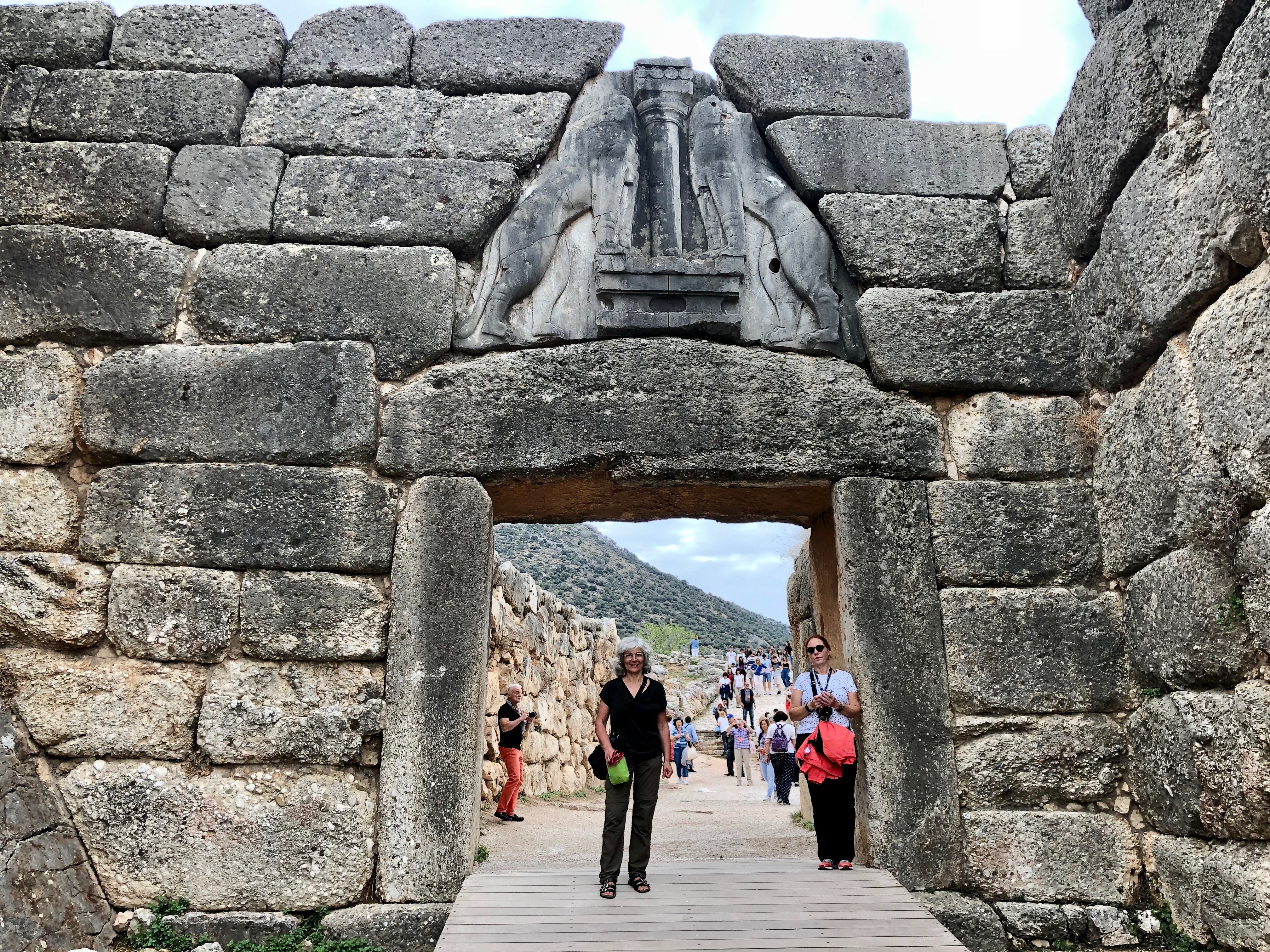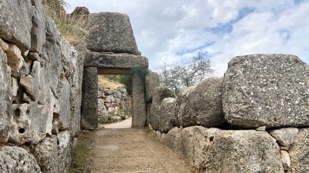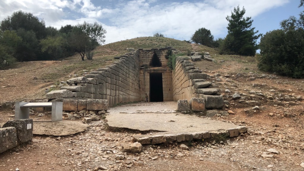 Aber hier nun unser Rundgang durch’s antike Mykene. Auf dem ersten Foto sieht man das ‚Löwentor‘, auf den weiteren Häuser, Gräber, Stadtmauern mit dem hinteren Stadttor, und auf dem letzten das als ‚Schatzhaus des Atreus‘ bezeichnete prachtvollste der in Mykene erhaltenen Königsgräber: