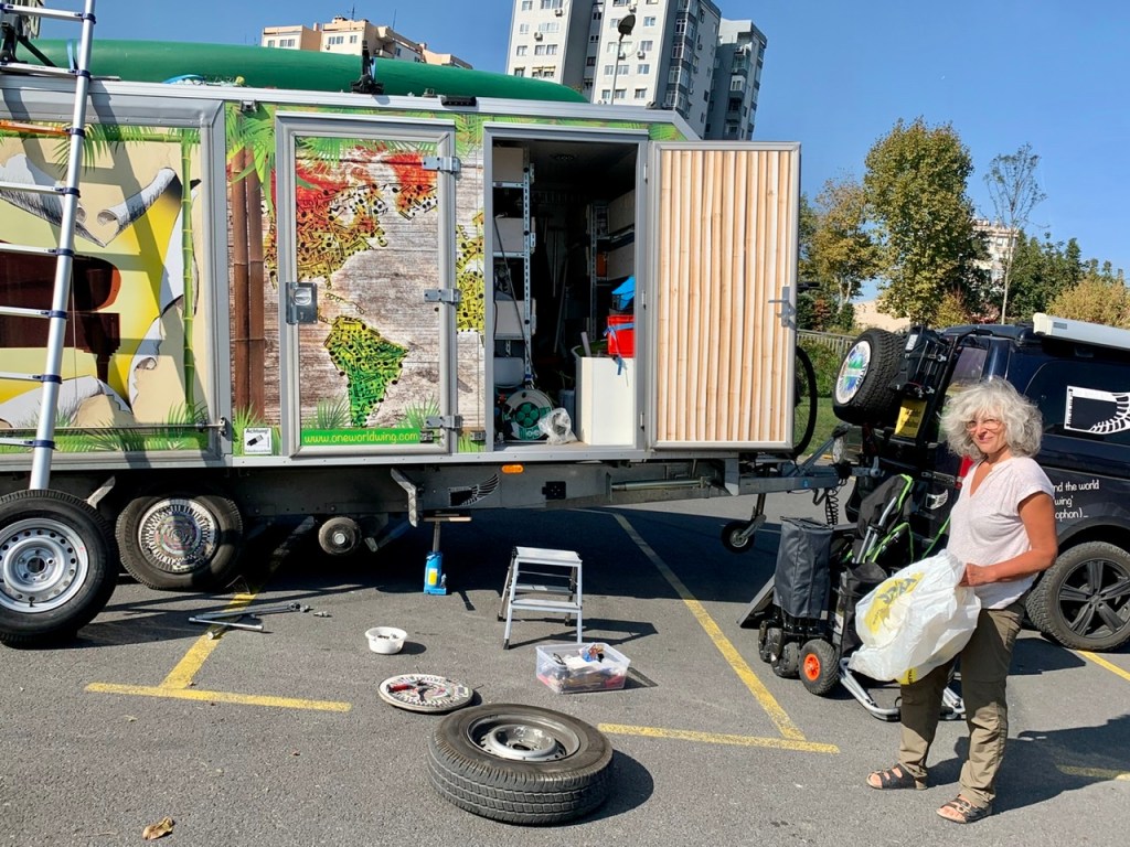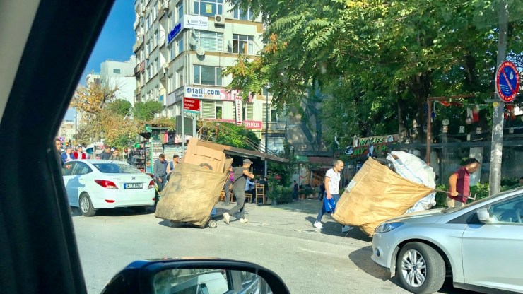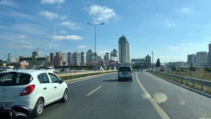In Istanbul nahm ich gleich mal eine kreisrunde Ausfahrt etwas zu eng, und ein Anhängerreifen touchierte hart den hohen Randstein. Platt! Wir erreichten auf drei Reifen den nahegelegenen Parkplatz des ‚Hyatt Regency‘ Hotels, der glücklicherweise groß und leer genug war, um hier den Reifenwechsel vorzunehmen. Super Einstand in der Fünfzehnmillionenmetropole…