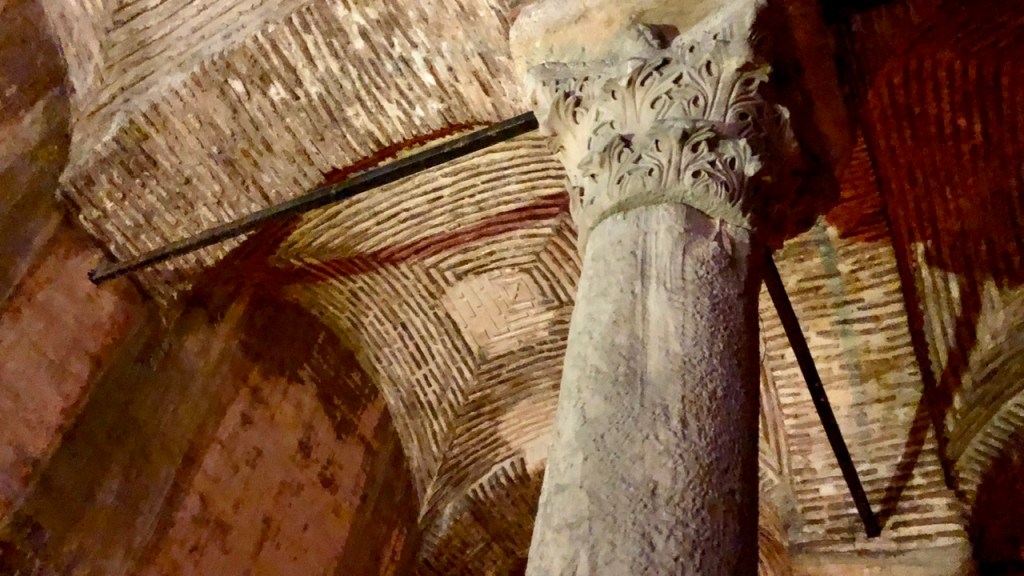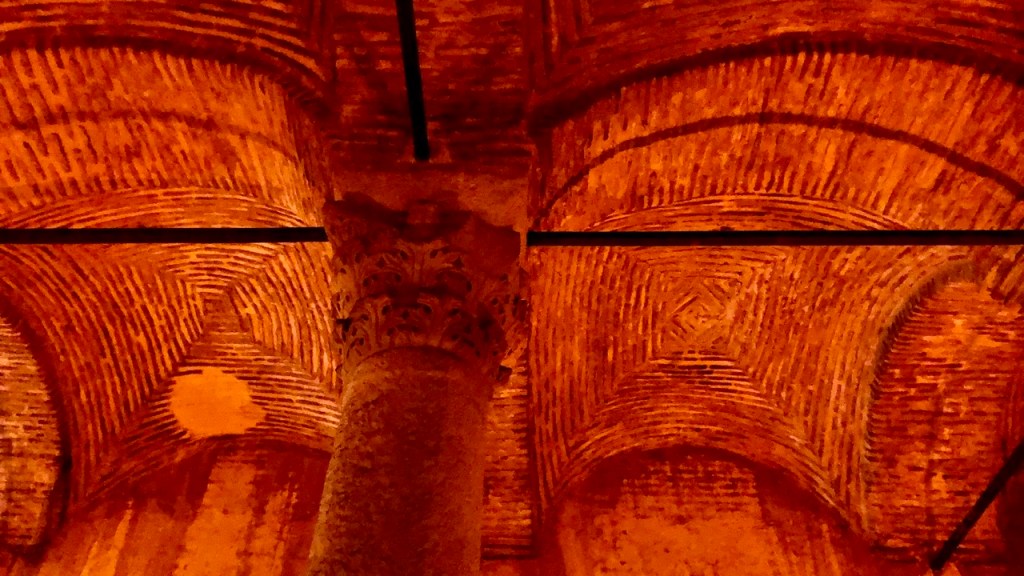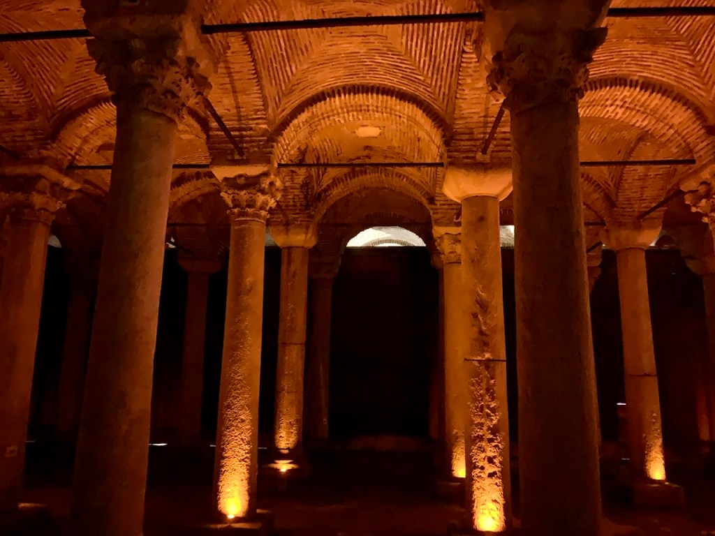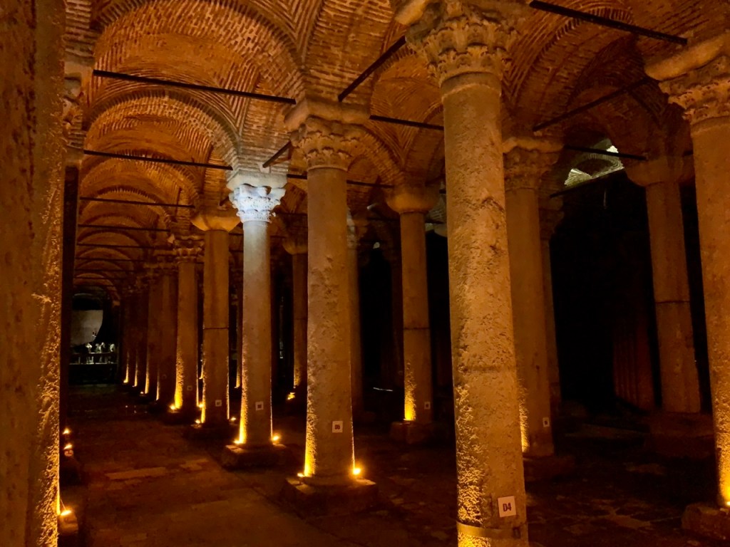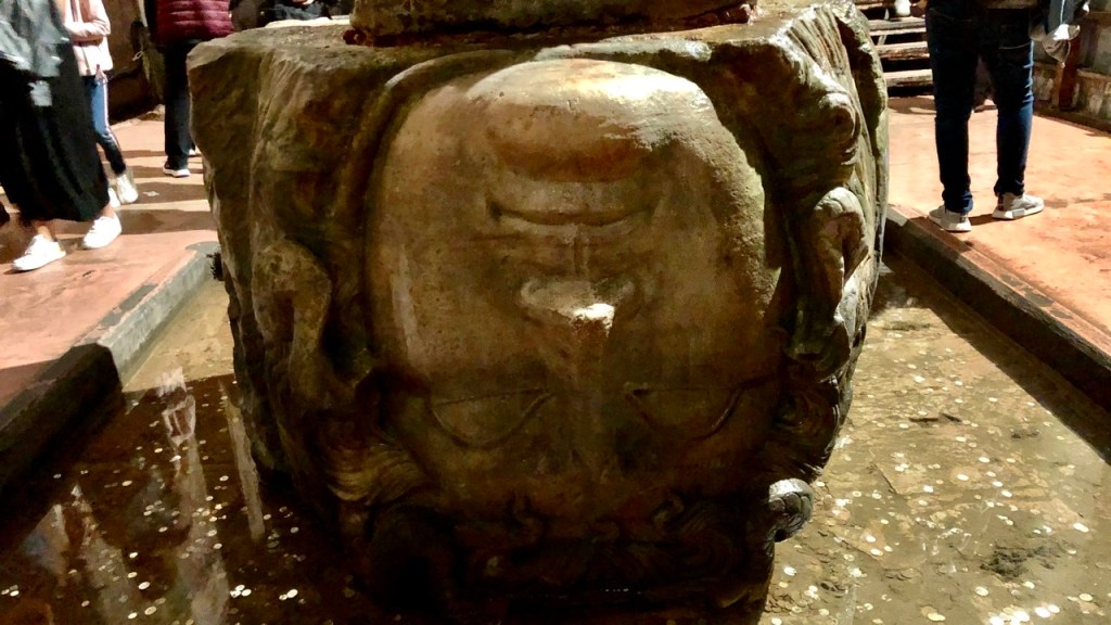 Sehr beeindruckend und atmosphärisch ist der sogenannte ‚Versunkene Palast‘, den wir uns anschließend vornahmen. Es handelt sich hierbei jedoch um keinen Palast, sondern um die ‚Cisterna Basilica‘, eine spätantike Zisterne des byzantinischen Konstantinopel. Markant sind hier auch die Reliefs der umgedrehten ‚Medusenhäupter‘: