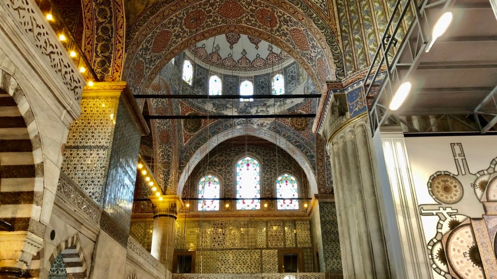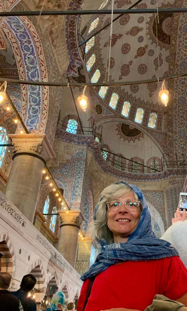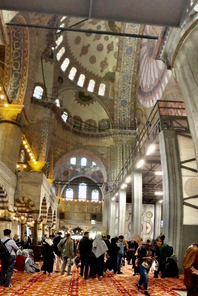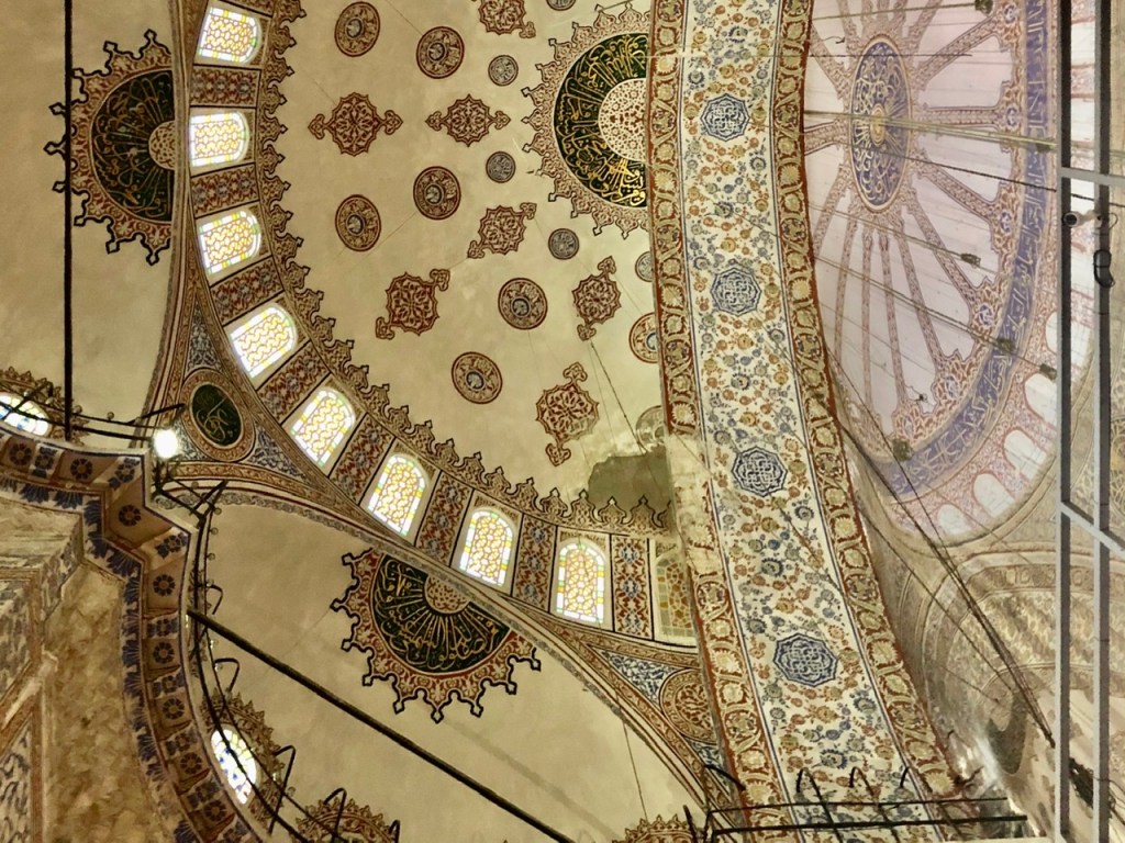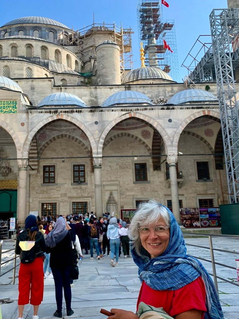 Heute konnten wir uns nun also endlich die ‚Blaue Moschee‘ – eigentlich heißt sie ja ‚Sultan-Ahmed-Moschee‘ – anschauen. Erwartungsvoll marschierten wir hin. Dort musste Conny ein Kopftuch über- und wir beide die Schuhe ausziehen. Dann durften wir hinein. Der Eintritt ist tatsächlich kostenlos. Doch was war das für ein nüchterner Anblick nach der prachtvollen ‚Hagia Sophia‘! Der größte Teil des Innenraums war aufgrund von Renovierungsarbeiten gesperrt und die Kuppel sowie einige andere Teile des Innenraums waren durch bedruckte Kulissen verdeckt. Genauso gut hätte man sich auch ein Bild im Internet anschauen können! Na ja, ok, fast… 😉
