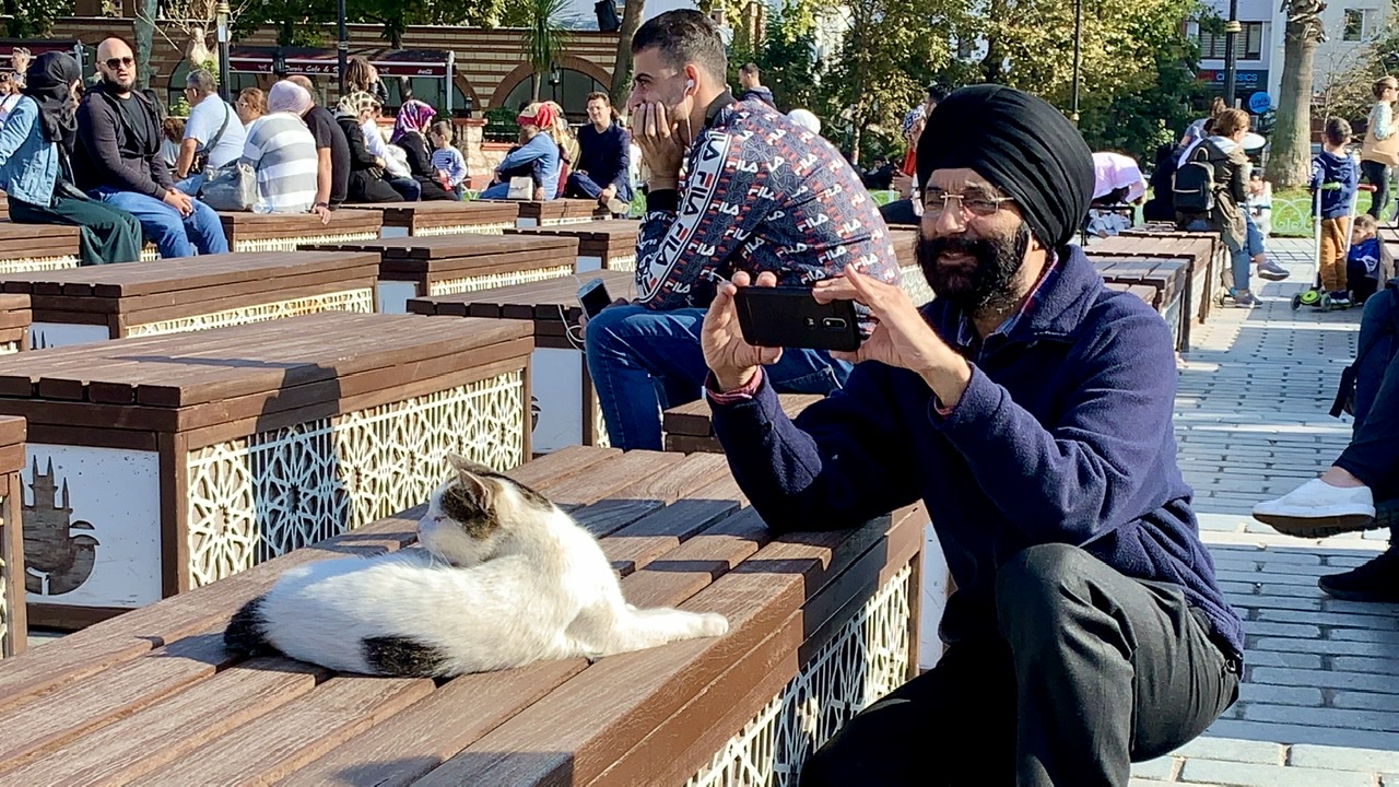 Auf dem Platz vor der Moschee gibt es Sitzgelegenheiten, wo sich viele Menschen von den Besichtigungen ausruhen. Dort habe ich als Deutscher in der Türkei einen Inder fotografiert, der eine Katze fotografiert. Was Conny und mich daran so begeistert, ist, dass die Menschen, so exotisch sie für uns auch wirken mögen, im Grunde doch alle gleich ticken.