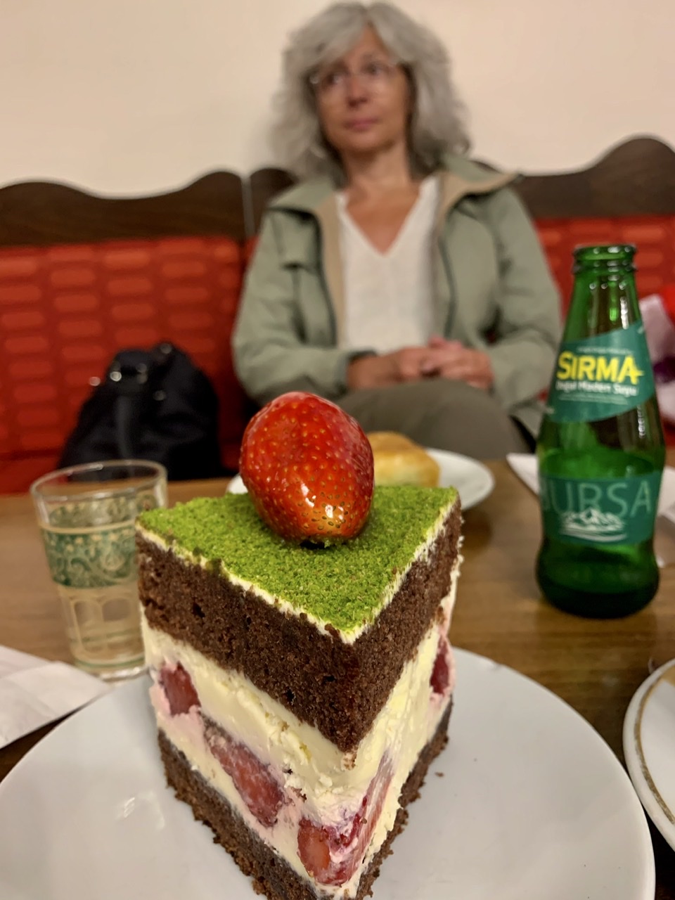 Wieder fast am Auto angekommen, lief uns noch ein großes Café mit überbordendem Kuchenangebot über den Weg. Die ‚Schwarzwälder Erdbeerbuttercremetorte‘ war für mich als absoluter Liebhaber der heimischen Variante mit Kirschen und Schlagsahne ein Muss! Conny hat sich das traditionelle Baklava genehmigt…