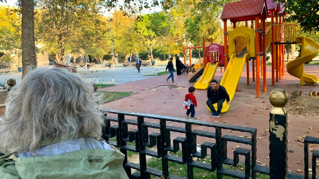 Nachdem der Radwechsel erledigt war, fuhren wir erst mal in irgendein Altstadtviertel, um ein paar erste Eindrücke dieser so andersartigen muslimischen Welt in uns aufzunehmen. Manches ist sehr exotisch, anderes auch nicht anders als bei uns, so beispielsweise der Vater mit seinem Kind auf dem Spielplatz. Nach einiger Zeit des Herumstreifens genehmigten wir uns den ersten, in weiterer Folge unausweichlichen, türkischen Tee.