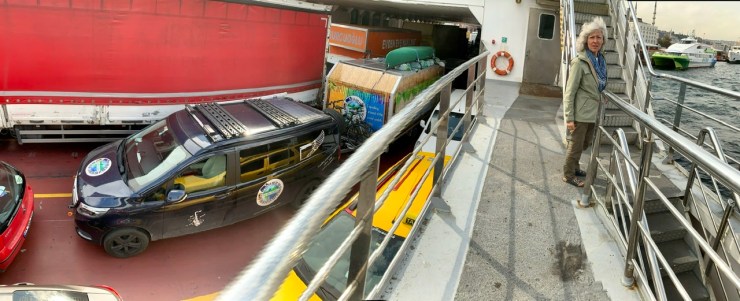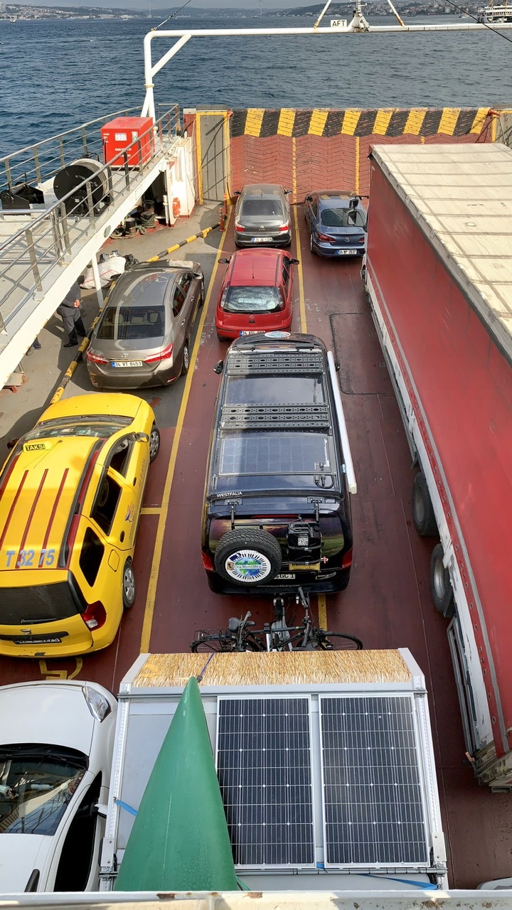 Für den Tunnel durch den Bosporus war unser Anhänger zu hoch. Zum Glück haben wir das rechtzeitig festgestellt. So gab es für uns nur zwei Möglichkeiten auf die asiatische Seite der Stadt zu kommen: Über die Autobahnbrücke, aber das wäre von unserem Standort ziemlich weit gewesen, oder mit der Fähre, was für uns, laut eines Busfahrers, den wir zu Rate gezogen hatten, die günstigste und bequemste Variante war. Also auf zum Fährhafen!