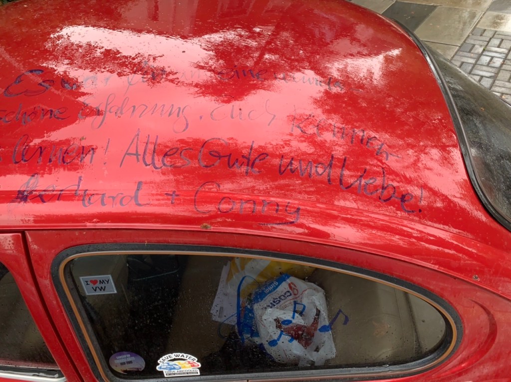 Göktürk und Sinem sind große Liebhaber alter VWs. Er hat seinen hellblauen Bus – und sie einen schönen roten, aber ziemlich altersschwachen, 45 Jahre alten Käfer, mit dem sie uns denn auch von unserem Auto abholten. Sie hatten noch einen Freund mitgebracht, und so stopften wir uns zu fünft in den klapprigen Käfer. Göktürk saß am Steuer, der Freund daneben, Sinem, Conny und ich machten es uns hinten bequem. Und los ging es. Die Federung konnte das Gesamtgewicht nicht mehr so ganz stemmen. Es war ein Erlebnis…