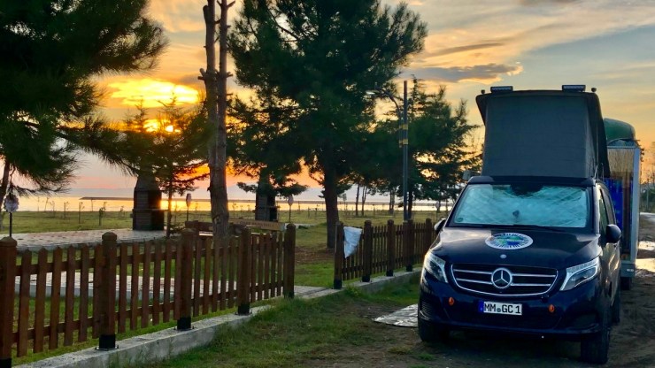 Nach unserer ersten Nacht auf dem sauteuren Parkplatz in Istanbul wechselten wir auf einen günstigeren direkt am Bosporus. Dort lernten wir das junge Ehepaar Göktürk und Sinem kennen, die für ein paar Tage mit ihrem alten T2 VW-Bus hier Urlaub machten. Sie stammten aus Ankara, wo Göktürk an der Universität Juniorprofessor für Landwirtschaft war – und Sinem seine Studentin. Wie wir mittlerweile erfahren haben leben sie derzeit für einige Monate in den USA.