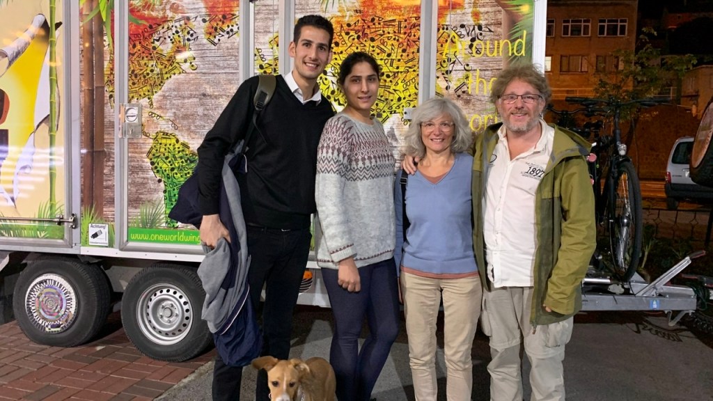 Anschließend brachten uns unsere neuen türkischen Freunde zurück zu unserem ‚Zuhause‘. Natürlich wollten sie endlich auch den Anhänger samt Musik vorgeführt bekommen. In Istanbul war dazu keine Gelegenheit gewesen, denn wir hatten die beiden erst am Morgen unserer Abreise von dort kennengelernt. Kaum hatten wir zu spielen begonnen gesellte sich noch eine reisefreudige Familie aus Rußland zu uns, die auch mit einem bewohnbaren Fahrzeug unterwegs waren. Natürlich mussten sich hernach alle auf unserem rollenden Gästebuch ‚verewigen‘. Aber auch wir durften uns revanchieren…